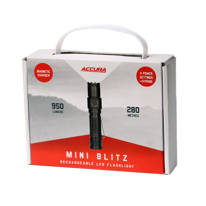Don't let darkness compromise your adventure. The Accura Mini Blitz ACMB950 is a compact yet powerful LED torch designed for the serious outdoorsman. Despite its pocket-friendly size, it projects a brilliant 950 lumens of light, illuminating targets and trails up to 280 metres away. Built to withstand the harshest conditions, the Mini Blitz boasts a robust IP67 waterproof rating, ensuring reliable operation in heavy rain and challenging environments. With a continuous runtime of 110 minutes and four versatile power settings plus a strobe function, you have complete control over your lighting needs. The complete kit includes a rechargeable 3000mAh battery, a charger cradle, and a USB cable, so you're always ready to go. Illuminate your path and enhance your hunt. Secure your Accura Mini Blitz torch from Xhunter Australia and take control of the night.