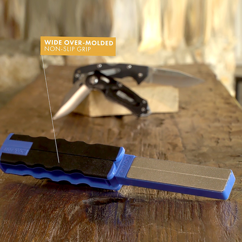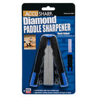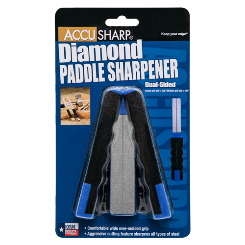 The AccuSharp® Diamond Paddle Sharpener is a double-sided sharpener featuring a coarse diamond grit surface for more aggressive sharpening and a fine diamond surface for honing and finishing. This sharpener also includes a sharpening groove for use with all kinds of hooks, darts, and pointed objects. The AccuSharp® Diamond Paddle Sharpener features a wide, over-molded grip for comfortable and secure sharpening. The folding handle allows you to fold and store your sharpener with ease.