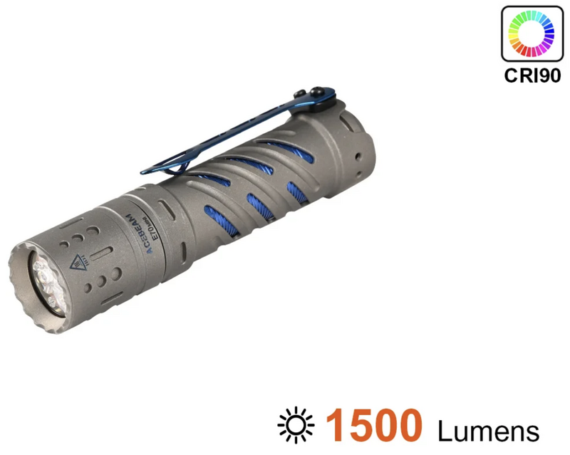 The Acebeam E70 mini titanium version is constructed from luxurious titanium and perfected with a sandblasted finish that represents a symbol of identity and taste, also compliments its unique knurling and blue spirals, which further amplifies the aesthetic of this high-performance pocket EDC flashlight. Equipped with the latest popular 519A LEDs and Acebeam's unique customized TIR lens, offers natural, balanced light for less eye strain during use and accurate color rendering. Giving users an optimized lighting experience with so soft and balanced beam and a 90+ CRI rating that puts your vision first. With six brightness settings and a strobe, capable of withstanding drops and complete immersion, the E70 mini-Ti is not only a slim, stylish, and distinct aesthetics EDC, but also built for rugged use and multiple applications.