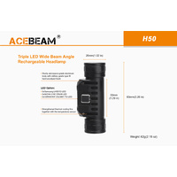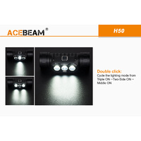 Acebeam H50 is lightweight headlamp with triple LEDs juxtaposed and TIR optical lens,which provides max 125°beam angle to illuminate everything in the user's field of vision, perfect choice for late night work or exploration, available 3 LED versions for different usages, 3 x Samsung LED output max 2000 lumens, 3 x Nichia LED bring CRI≥90 and 3 x Osram LED throw 209 meters. Also, H50 features 3 of the selected LED and can be toggled between Triple-On, Two-Side-On and Middle-On. Lastly, H50 is USB-C rechargeable which can quickly charge a 18650 battery right inside the light.