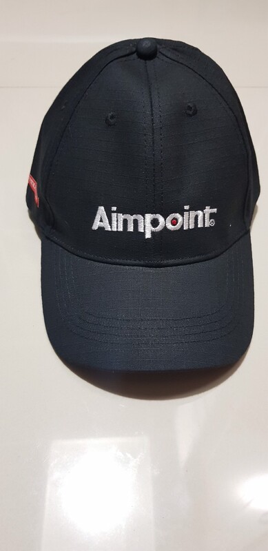 Cap in black colored ripstop fabric with white/red Aimpoint logo and woven red “Future in Sight” slogan ribbon on one side.