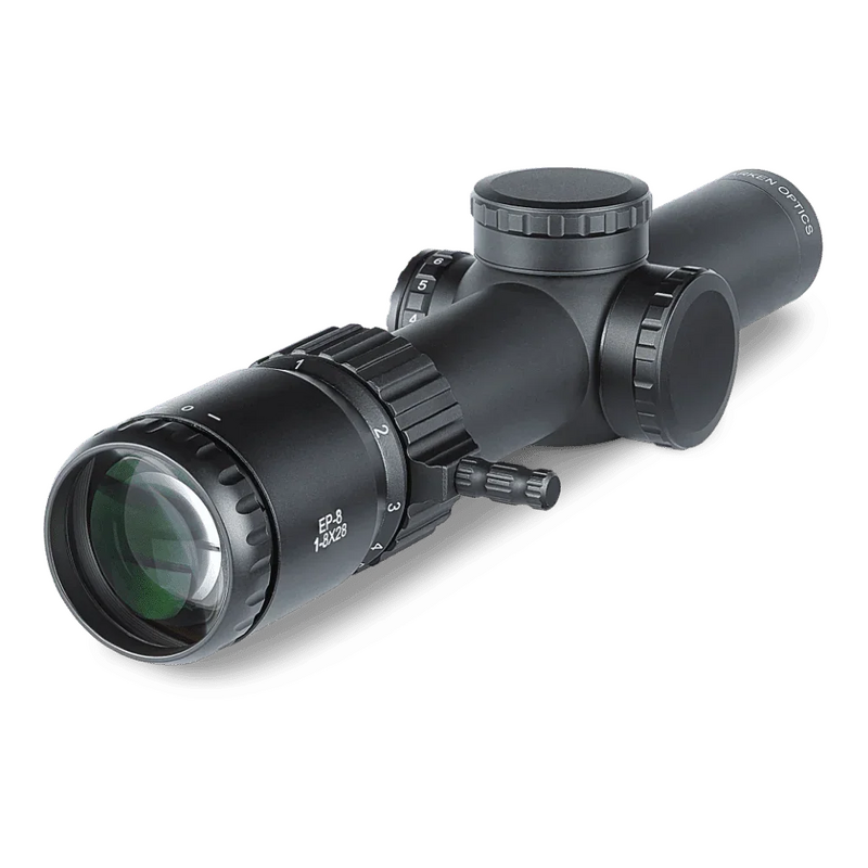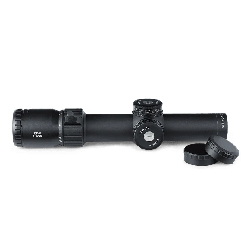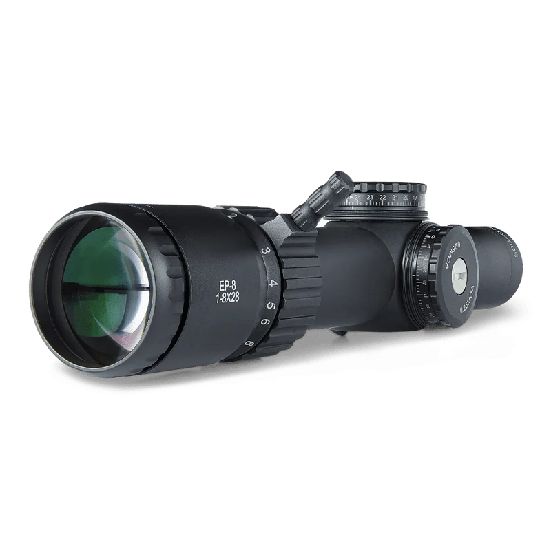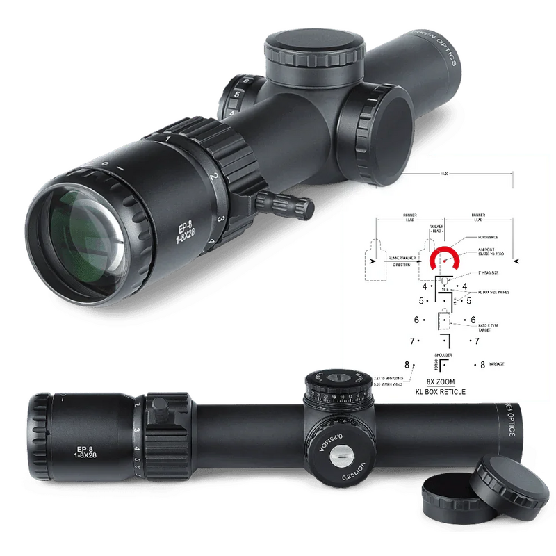 The EP8-18KLB boasts a 1-8x28mm First Focal Plane (FFP) with a 34 mm tube providing ample adjustment range, making it suitable for both close-quarters combat and mid-range engagements. Constructed from aircraft-grade aluminum, this scope is waterproof, fogproof, and shockproof, promising durability in Australia's diverse environments. With a red illuminated reticle powered by a CR2032 battery, maintain a clear view in low-light conditions, enhancing your hunting experience.