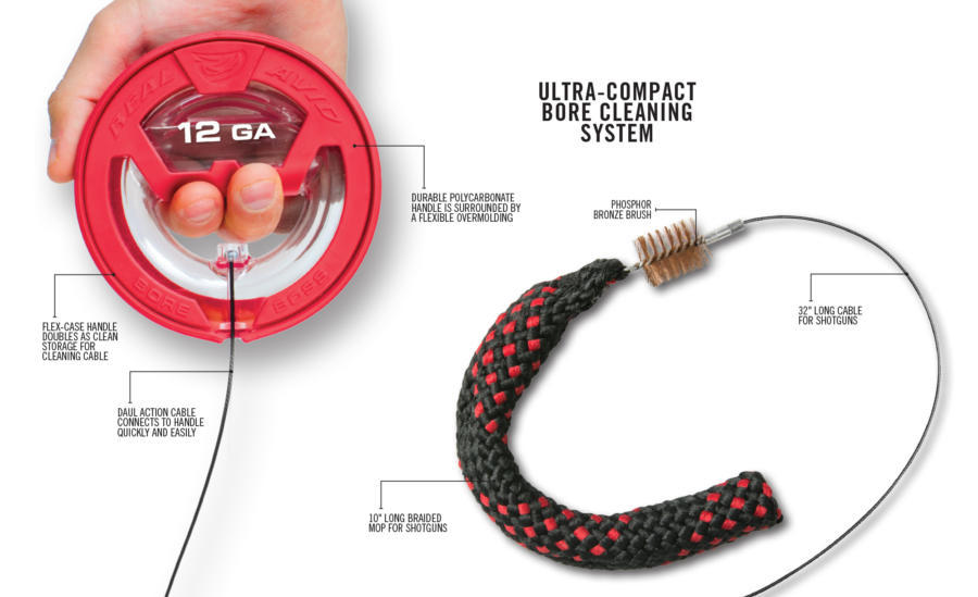 This Real Avid Bore Boss is the ultra-compact smarter bore cleaner for your 12 Gauge. The Bore Boss is the first ever self-storing, easy-feeding, clean-pulling, field-ready, hassle-free, pure-genius bore cleaner. The single piece cable with integrated phosphor bronze brush and braided mop wraps around the unique flex-case handle to keep the system stowed and organized. To use, simply flip, feed, clip, and pull. Throw it in you pack, or put it in your pocket. It's the next best thing to a self-cleaning gun.