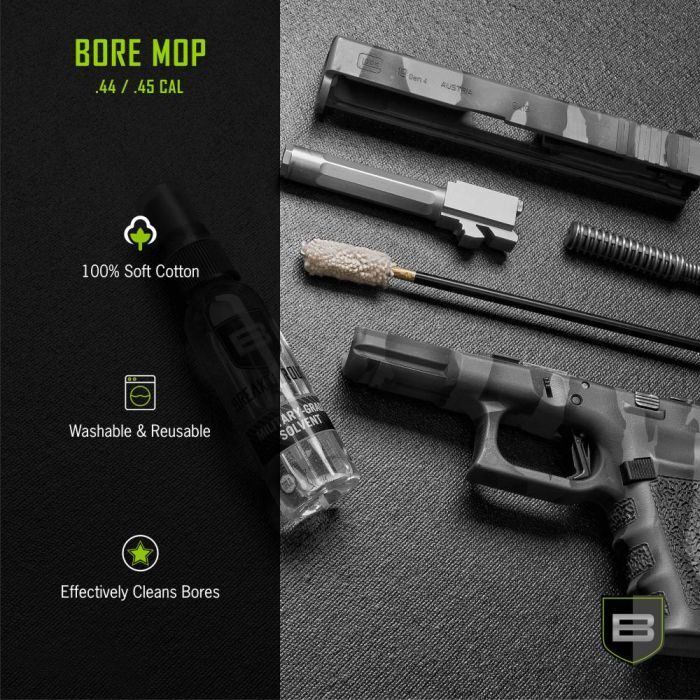 • GUN CLEANING SUPPLIES: Get the best clean without scratching or damaging your rifling. This .44 / .45 Cal bore mop is made from 100% cotton that is soft, washable, reusable, & is outfitted with external brass threading for easy attachment.