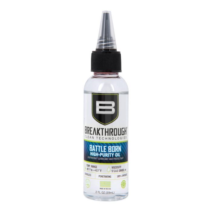 The Breakthrough Clean Technologies® Battle Born High Purity Oil is a general-purpose low-viscosity oil that is a lighter version of our bestselling HP Pro Oil, is a blend of high-quality, 100% synthetic gun cleaning oils. This non-toxic, odorless lubricant is treated with the highest quality anti-rust, anti-foam, and anti-wear additives to provide ultimate and lasting corrosion protection and lubrication under extreme pressure and a broad temperature range (from -90°F to 417°F).