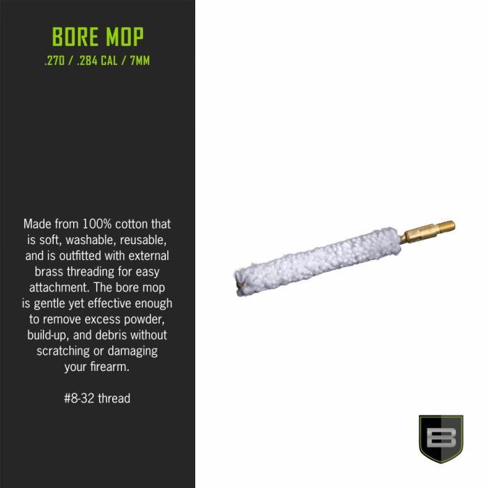 • GUN CLEANING SUPPLIES: Get the best clean without scratching or damaging your rifling. This .270 /.284 / Cal / 7mm bore mop is made from 100% cotton that is soft, washable, reusable, & is outfitted with external brass threading for easy attachment.
