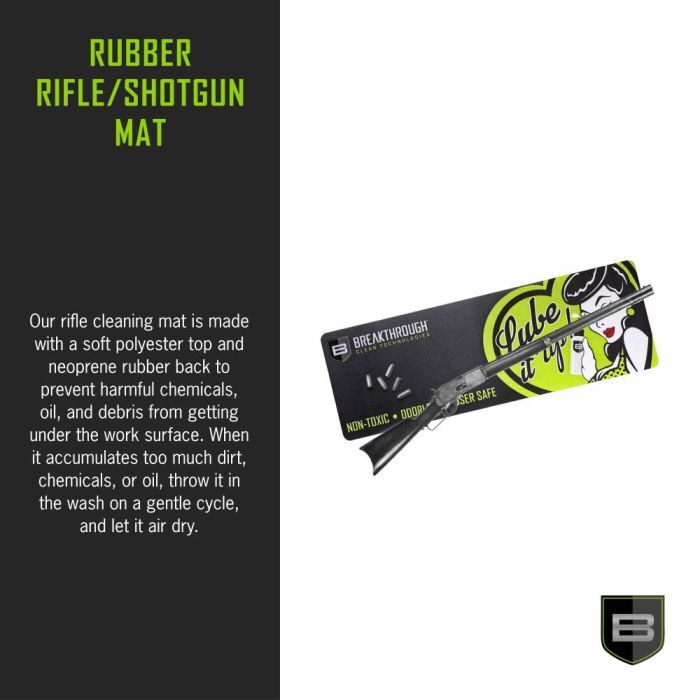 Our Breakthrough Clean Technologies® Rifle Cleaning Mat with a soft polyester top and neoprene rubber backing to keep everything in place and prevent your work surface from sliding around. This mat will also keep harmful chemicals, oil and dirt from getting to the work surface under the mat. When the mat begins to accumulate too much dirt, chemicals or oil, simply throw it in the wash on a gentle cycle, and allow to air dry. Mat measures 36-inches long x 12-inches wide.