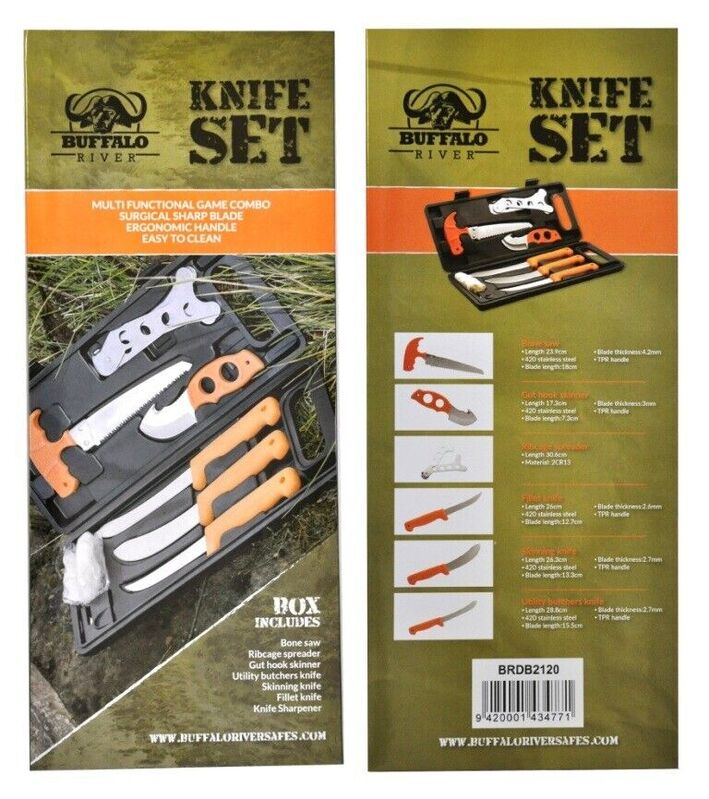 Multi-Functional Game Combo Set. Set has an ergonomic handle and is easy to clean. Includes: Bone saw Ribcage spreader Gut hook skinner Utility butchers knife Skinning knife Fillet knife Knife Sharpener.