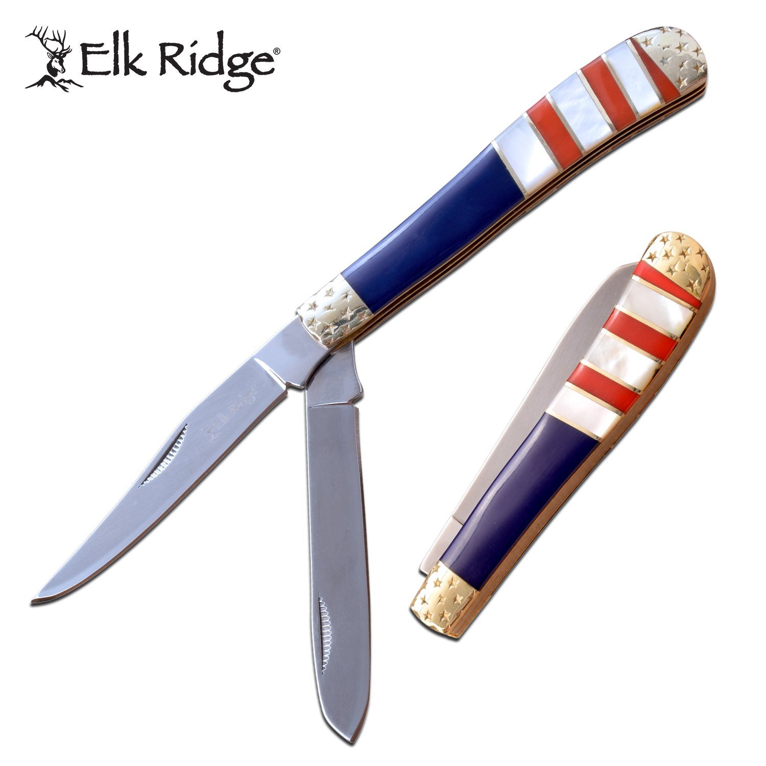 NEW in Box Elk Ridge 5.25" Overall Manual Opening Gentleman's Knife with 3Cr13 Steel 2.75" Trapper Blade and 2.5" Secondary Blade, Red White and Blue Acrylic Handle with Gold Star Design.