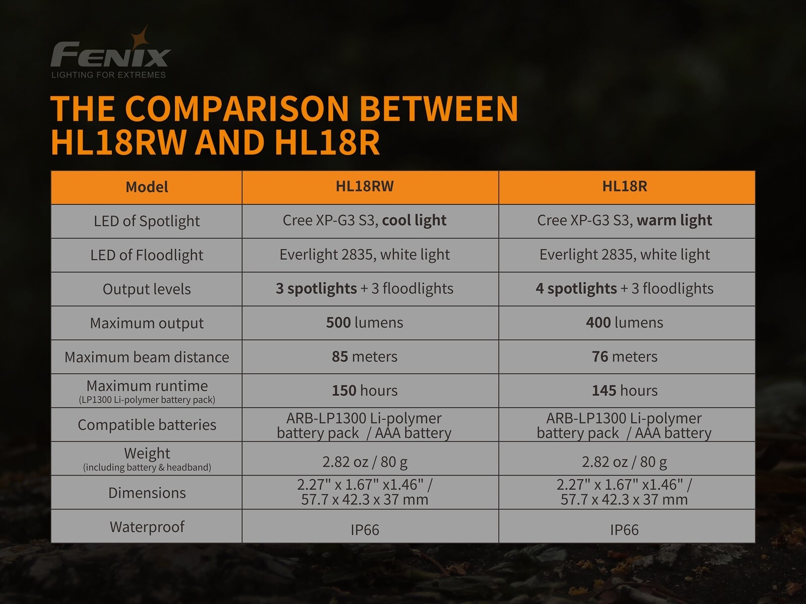 A new level of brightness has been added to the Fenix HL18RW. This upgraded model has a maximum output of 500 lumens of cool white light. The HL18RW has dual power sources that both can be charged via the micro USB port on the headlamp. The first power option is the 1300mAh Li-polymer battery pack that is included with purchase. You can also use three rechargeable AAA batteries as a secondary power source. Only weighing 2.8 ounces, the HL18RW is perfect for long hikes or trails because it is incredibly lightweight. Additional features include a battery level indicator, reflective headband, adjustable beam, and lockout function to prevent accidental activation. The HL18RW will also include a Micro USB charging cable and user manual, so you charge and use the headlamp right out of the box.