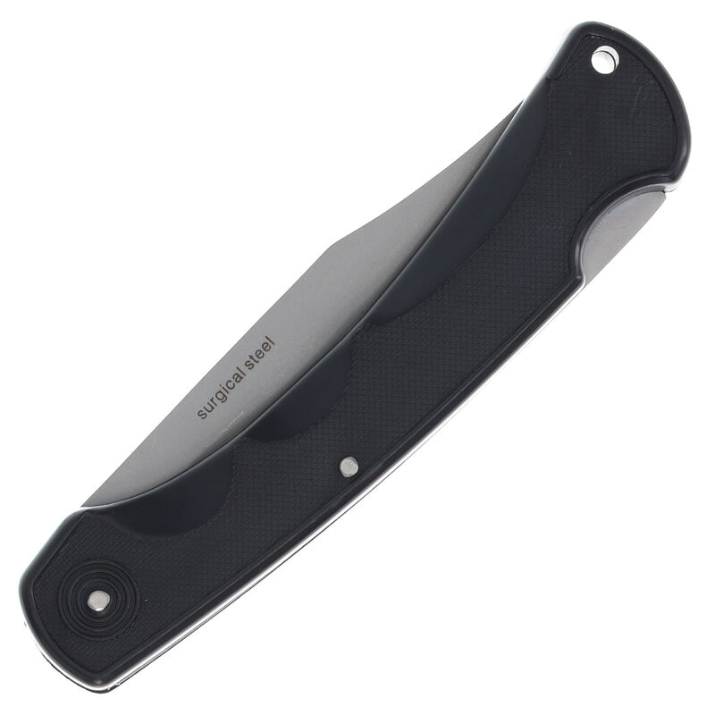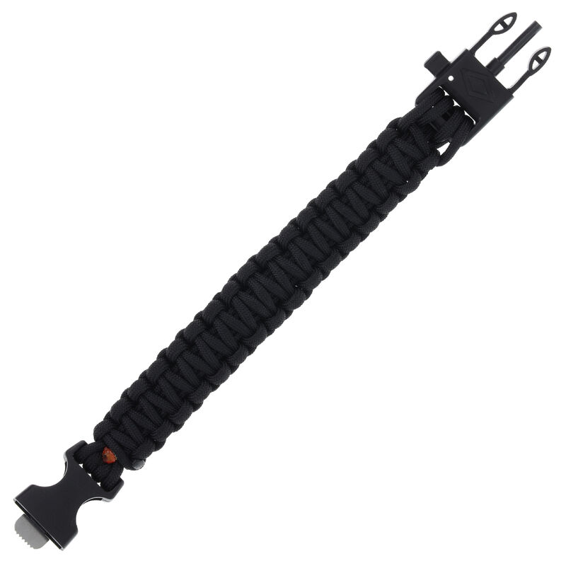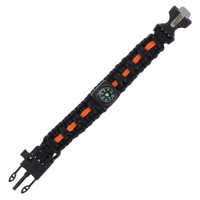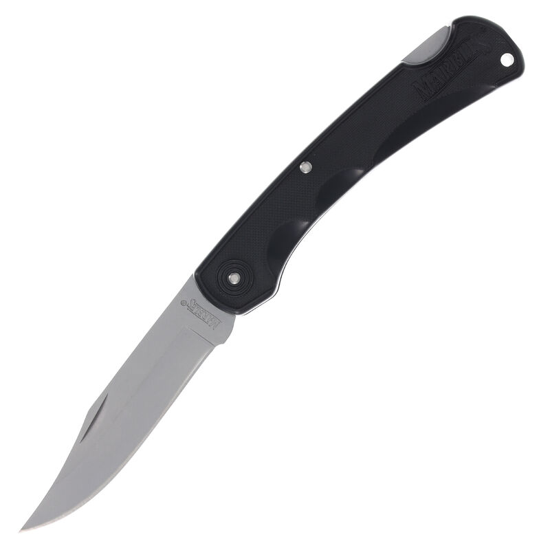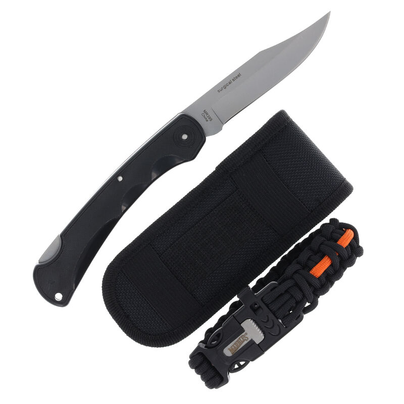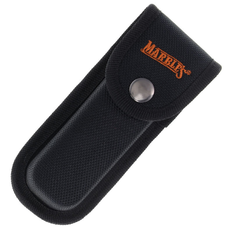 - Blade Material: 440A Stainless Steel - Blade Style: Clip Point - Blade Length: 3.75 inches - Blade Thickness: 0.12 inches - Edge Type: Plain - Handle Material: Black textured composition - Handle Features: Finger groove and lanyard hole - Closed Length: 5 inches - Weight: 2.4 oz - Knife Type: Folding Knife - Lock Type: Lockback - Sheath Material: Nylon - Sheath Type: Belt Loop (vertical or horizontal wear) - Paracord Features: Black braided with line strand technology and fire-starting outer strand - Additional Features: Integrated safety whistle and compass - UPC: 871373003956 - Brand: Marbles