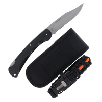 The Marble's Brushy Mountain Survivalist Set MR395 is a must-have for outdoor enthusiasts and hunters in Australia, tailored for those who demand practicality and reliability in their hunting gear. Featuring a 3.75-inch 440A Stainless Steel clip-point blade with a non-glare finish, this folding knife is built to perform in the rugged Australian wilderness. Its robust yet lightweight design, weighing only 2.4oz, ensures ease of carry and quick accessibility during critical moments. Designed with the user in mind, the textured composition handles offer a secure grip with a finger groove and lanyard hole, making it ideal for shooting and hunting activities. The integrated black nylon belt sheath provides versatile carrying options, allowing you to attach it vertically or horizontally according to your preference. This set is a perfect companion for those requiring efficient and practical shooting accessories in the field. Further enhancing its utility, the survivalist set includes a black braided paracord with line strand technology for fishing and strike strand technology for fire-starting. The integrated safety whistle and compass are essential tools for navigation and safety, complementing your outdoor adventures and rifle scope expeditions. Ideal for the Australian terrain, this set embodies the high standards of Xhunter Australia, offering a dependable and versatile addition to your outdoor arsenal.