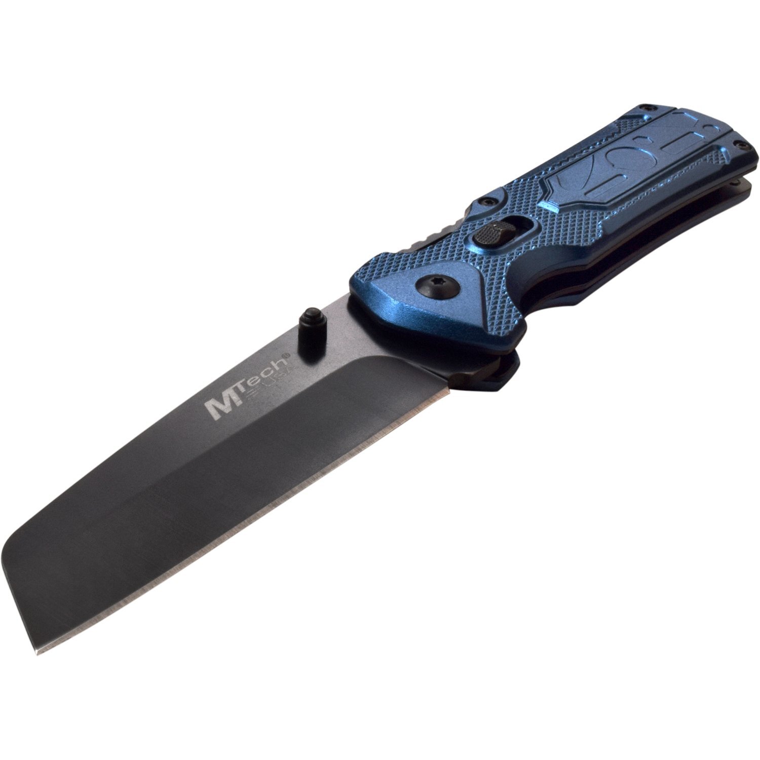 The Master Cutlery MTech USA Multitool Folder Blue features a 3.5 inch stainless steel sheepsfoot blade with a black coated finish and a blade thickness of 0.11 inch. It's a manual opener with ambidextrous thumb studs. This linerlock has textured blue aluminum handles with a spring-loaded multitool hidden inside as well as a stainless steel tip-up pocket clip, a glass breaker tip, and a lanyard hole. It's 4.5 inch closed, 8 inch overall, and weighs 5.93oz.