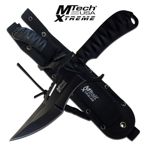 One of our new favourite knives from MTech Xtreme USA! It's an unusually shaped fixed blade knife with a combination of curved and angular lines.This knife features a 5mm thick, 6" long black, non-reflective stainless steel blade with dual edge type that's perfect for both slicing and piercing tasks. The blade also includes a slot that helps with weight reduction and aggressive jimping that provides positive grip during use.