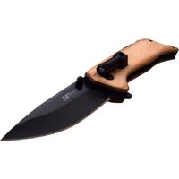 The MTech 1082N features a 3.25 Inch 3Cr13 drop point blade with a black finish. It’s a manual opening with blade flipper and thumb stud with a ball bearing pivot system. This liner lock has wood handles with a tip-down pocket clip and a lanyard hole.