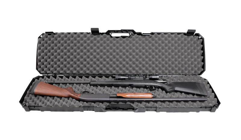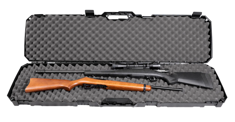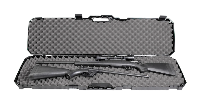 - Capacity: Two rifles or shotguns up to 50.5 inches long - Material: High-impact plastic - Latch System: Four snap latches - Locking Points: Four padlock points - Padding: Convoluted foam for impact protection - Handle: Integrated for easy transport - Tie-Down Grooves: Available for ATV securing - Color: Black - Inside Dimensions: 128cm x 29cm x 8cm - Outside Dimensions: 131cm x 37cm x 11cm - Country of Manufacture: USA