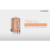 13.4g, 380 Lumens: The Nitecore TINI Cu is rechargeable mini metallic keychain light. It utilises a CREE XP-G2 S3 LED and has maximum output of 380 lumens. It has demo mode and daily mode with memory function. The built-in 280mAh Li-ion battery pack can be charged via micro-USB cable. It is available in many colours in Aluminium version . Tiny 380 lumen rechargeable keyring light.