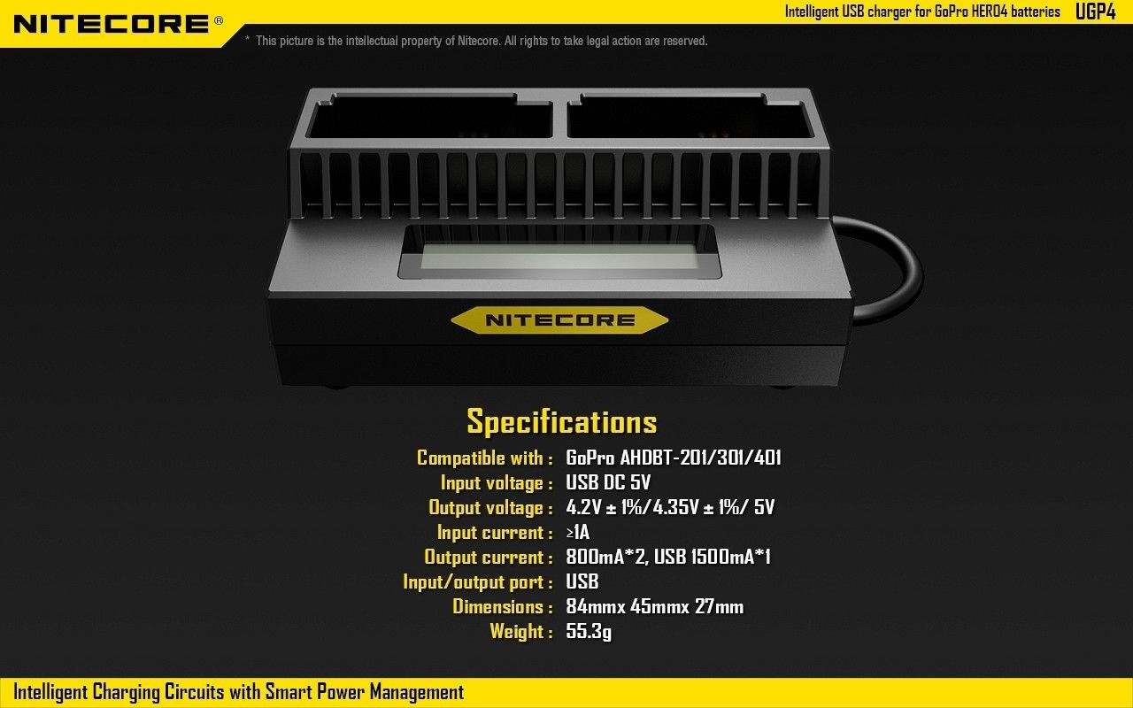 The UGP4 is the latest innovation from Nitecore that is a USB powered Li-ion battery charger designed for GoPro HERO3 and HERO4 compatible batteries. It is compact, fully automated with clear digital display of detail charging status and can charge batteries and devices simultaneously.