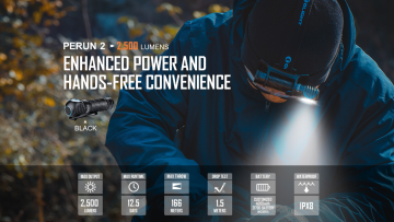 ✦ Multifunctional: with max 2,500-lumen output, the Perun 2 can be used as both a right-angle headlamp and as a powerful EDC