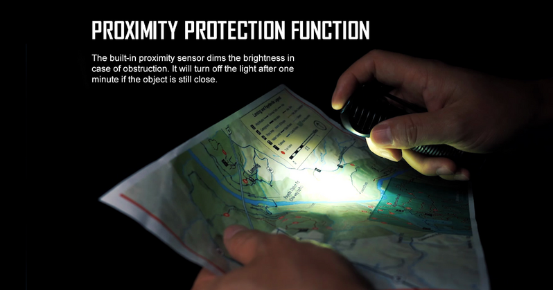 The built-in proximity sensor will reduce the brightness for protection when it detects an obstruction nearby.