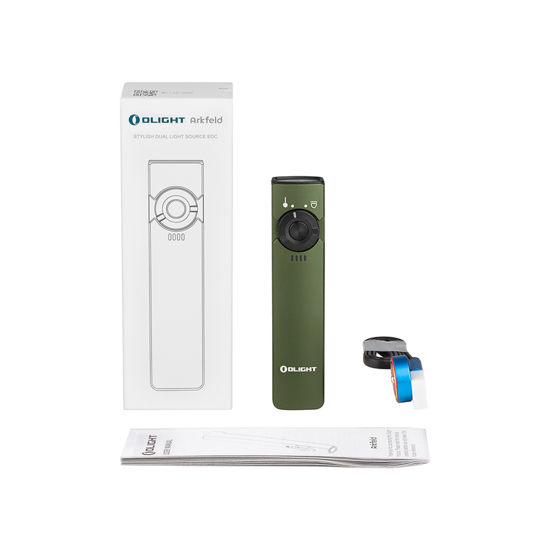 Experience a revolutionary approach to everyday carry lighting with the Olight Arkfeld in OD Green. This is Olight's first dual-light source EDC flashlight, ingeniously designed with a flat, ultra-thin profile that prevents rolling and is exceptionally comfortable to carry in your pocket. The Arkfeld seamlessly integrates a powerful 1000-lumen white light with a Class 1 green laser, making it a versatile tool for any situation. A simple rotary selector and central button allow for intuitive switching between the two light sources and cycling through five distinct brightness levels, from a powerful turbo mode to an energy-saving moonlight mode with an 8-day runtime. Crafted from durable aluminum alloy with an IPX7 waterproof rating, the Arkfeld is built to withstand the rigors of daily use. The magnetic tail allows for hands-free operation by attaching to any ferrous metal surface, while the convenient magnetic USB charging cable snaps into place for a quick and easy recharge of the built-in 1050mAh battery. Upgrade your EDC setup with the innovative design and dual-functionality of the Olight Arkfeld from Xhunter Australia.