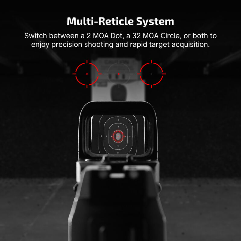 • Reticle: 2 MOA Red Dot, 32 MOA Circle, or combination