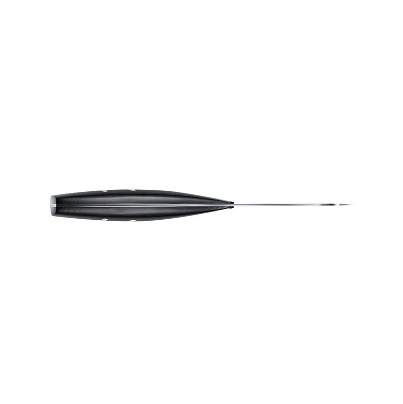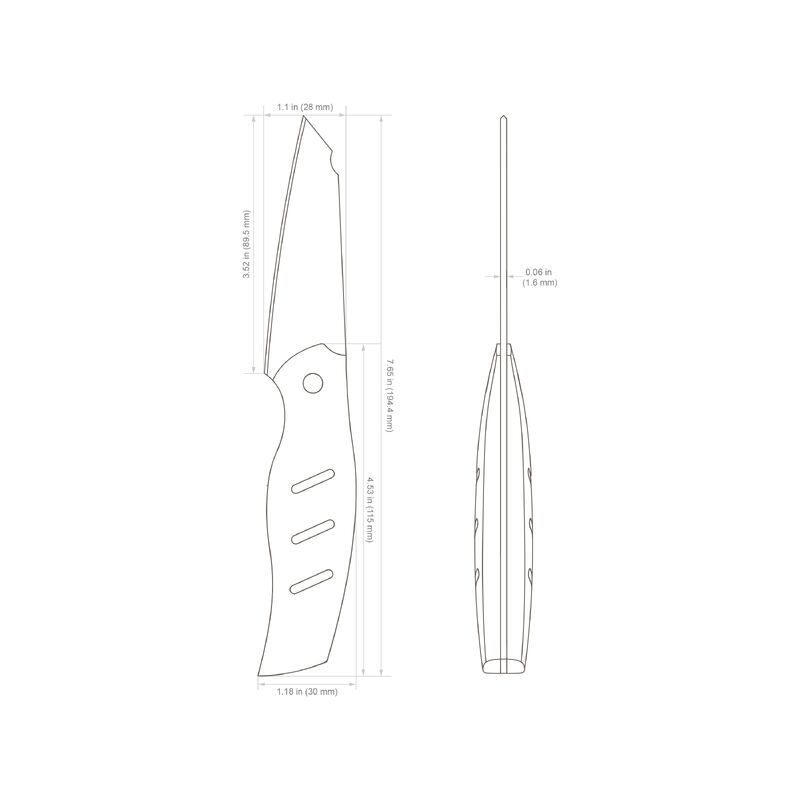 The knife's long-lasting G10 handle stands out with its resistance to heat, cold, and water penetration. It is impervious to acids, ensuring durability without deforming, breaking, or chipping. This feature makes it perfect for handling various tasks, from preparing game in the field to slicing vegetables at camp. Its well-polished finish allows for easy cleaning, maintaining hygiene and performance for your next adventure.