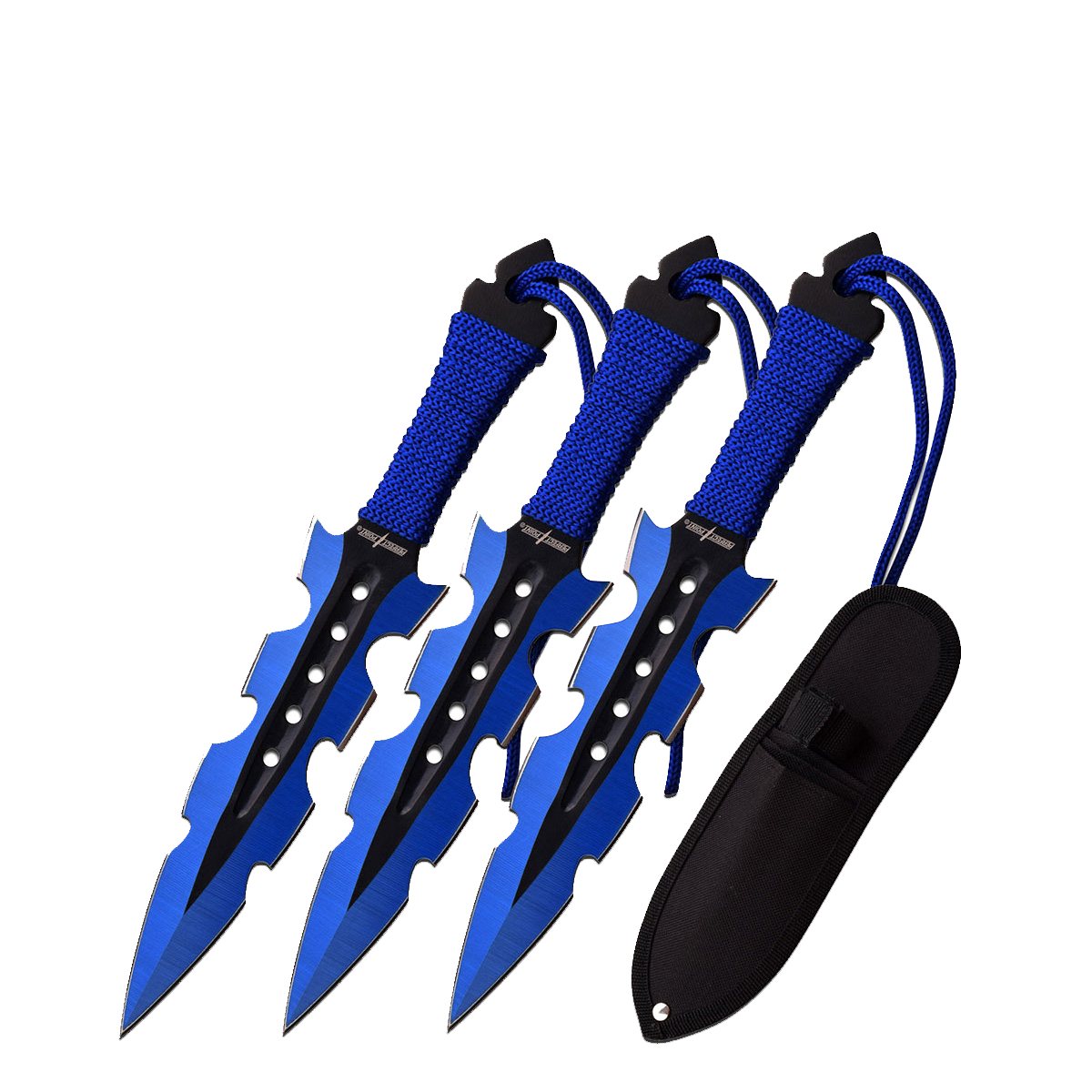 The Perfect Point Blue Strike Throwing Knife Set comes with 3 matched and balanced blades that are ideal for target practice and can make a great addition to any knife collection. Each knife handle is wrapped with a blue cord that can be left on or removed according to your preferences.