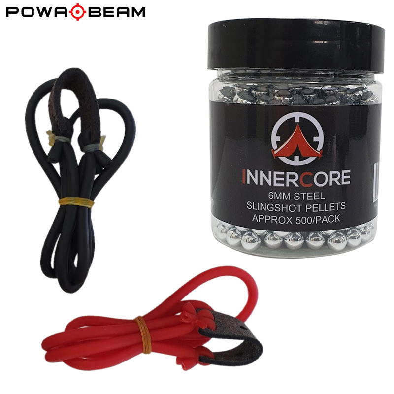 Quality replacement bands to suit your Fat Tiger Slingshots, and 8mm steel slingshot pellets! The replacement bands are made of quality latex with a durable genuine leather pouch, one red and one black. There are approximately 500 pellets per pack and they come in a handy resealable pack.