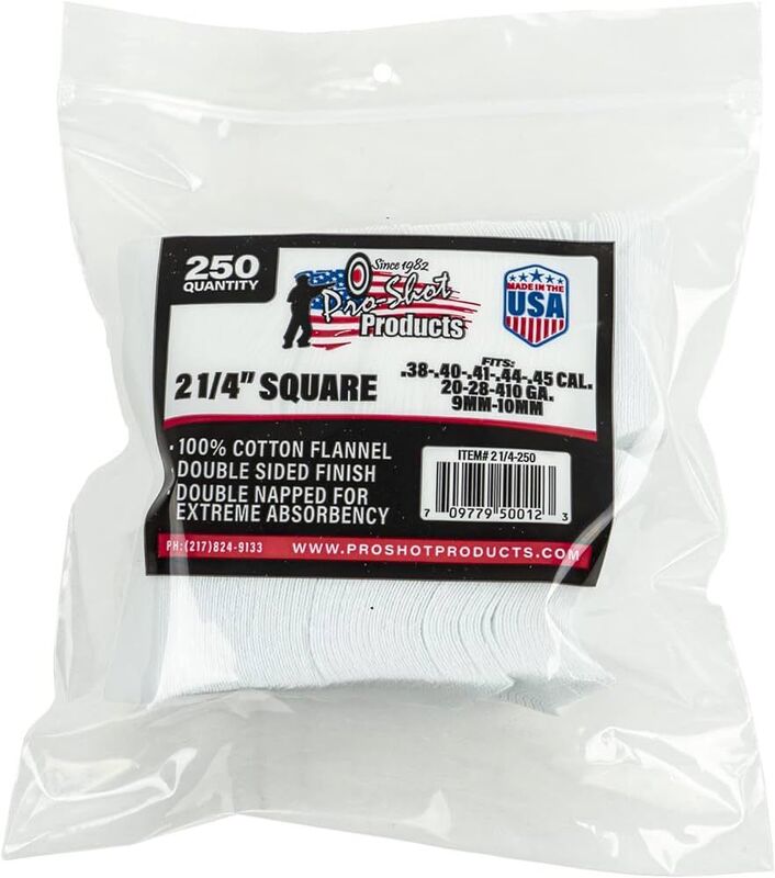 Achieve a superior clean and protect your firearm's barrel with Pro-Shot's world-renowned cleaning patches. Made from 100% American-grown cotton flannel, these patches are finished on both sides for maximum absorbency and durability. Their tightly woven, high thread count material effectively traps fouling and residue, carrying it out of the bore with minimal abrasive contact to the rifling. Trusted by competitive shooters, hunters, and law enforcement worldwide, these patches deliver unparalleled cleaning power and consistency, ensuring your firearm performs at its best. Keep your firearms in pristine condition. Add this 250-pack of Pro-Shot cleaning patches to your maintenance kit from Xhunter Australia.