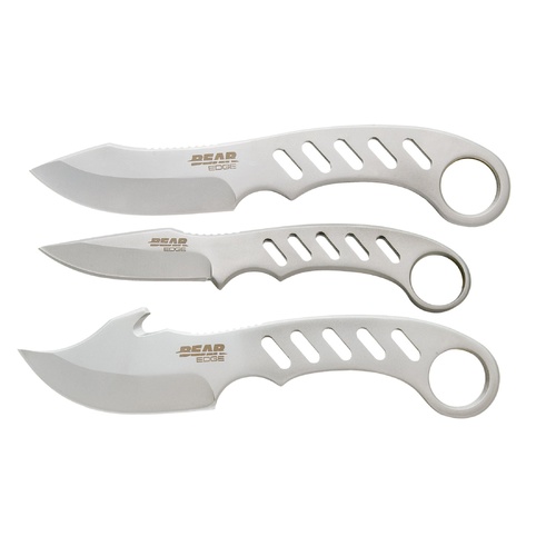 The Bear Edge 3-Piece Game Set was designed to easily manage any hunting or field dressing cutting chores. It comes equipped with a caping blade, small skinner, and a large skinner with a guthook. Each blade is made from 440 stainless steel with durable bead blast finishes. Item includes a heavy duty ballistic nylon sheath for comfortable belt carry.