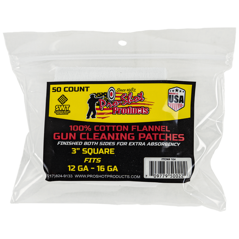 American grown Cotton & American Design come together to form the best cleaning patch in the world! Experience the advantage with Pro-Shot's Superior Weave Technology (SWT), our High thread count with tightly woven material along with our double napped finish on both sides.  Our (SWT) Superior Weave Technology creates cleaning patches that have become known worldwide for their unparalleled cleaning ability.  Dozens of world records have been shattered with shooters using our cleaning patches!  Pro-Shot Cleaning Patches are the foremost in cleaning technology and quality, often imitated, never duplicated!