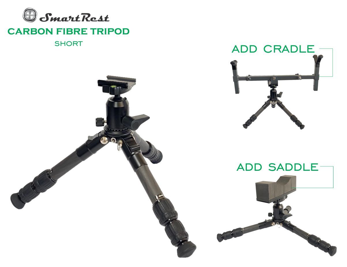 SmartRest Tripod (short model) is a carbon fibre tripod and quick release clamp ball head. Utilizing light weight design and rock solid support this tripod is used as a base for the Lean-To Saddle to create a bench rest or attach a SmartRest Cradle to create a more versatile and multipurpose bench rest and field tripod.