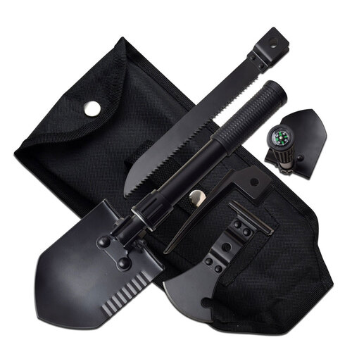 Survivor 5 In 1 Multi Purpose Tool is made with a heavy duty steel construction & includes a Shovel, Compass, Axe, Saw, Pick and Nylon Carry Case.