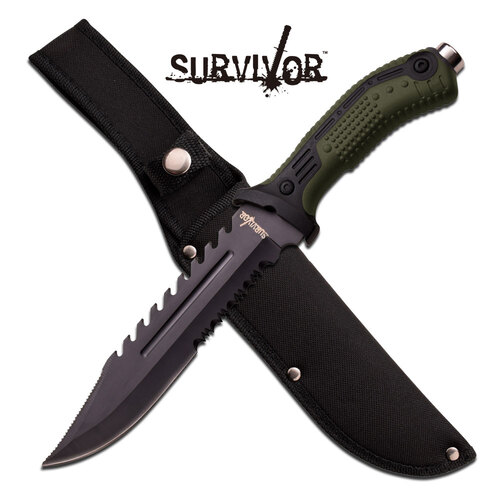 A great choice for hunting and outdoor adventures, the hk-793 Series fixed blade survival knife from Survivor features a 12.75-Inch overall length and an injection rubber and nylon fiber handle with texturing for a firm grip. The 7.5-Inch, 3.2mm thick half-serrated stainless steel blade features a heavy duty reverse serrated sawback. It comes with a 600-denier nylon sheath. Geared toward outdoor activity, Survivor offers a wide variety of classic survival knives and rugged fixed blade knives.