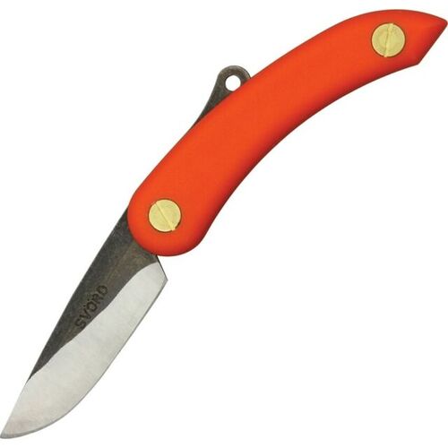 The Svord Mini Peasant knife is simple and efficient, just what you need in a hard-working knife. It features a two-tone finished steel drop point blade to handle all your cutting chores. The blade features a lanyard hole on the tang and is non-locking. The handle is lightweight orange polypropylene with a light texture.
