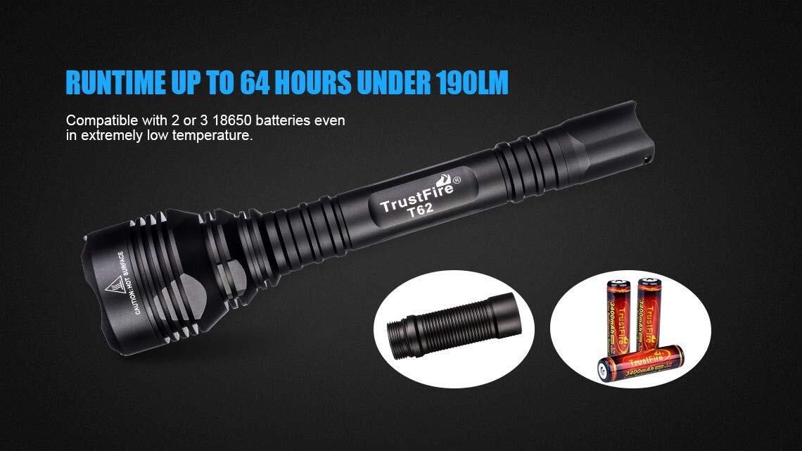 • TrustFire T62 LED Flashlight utilizes a CREE XHP70 and delivers a MAX 3600 Lumens which produces an intense bright white beam of up to 431 meters. Powered by 2x18650 or 3x18650 3.7V rechargeable batteries (Batteries NOT Included).