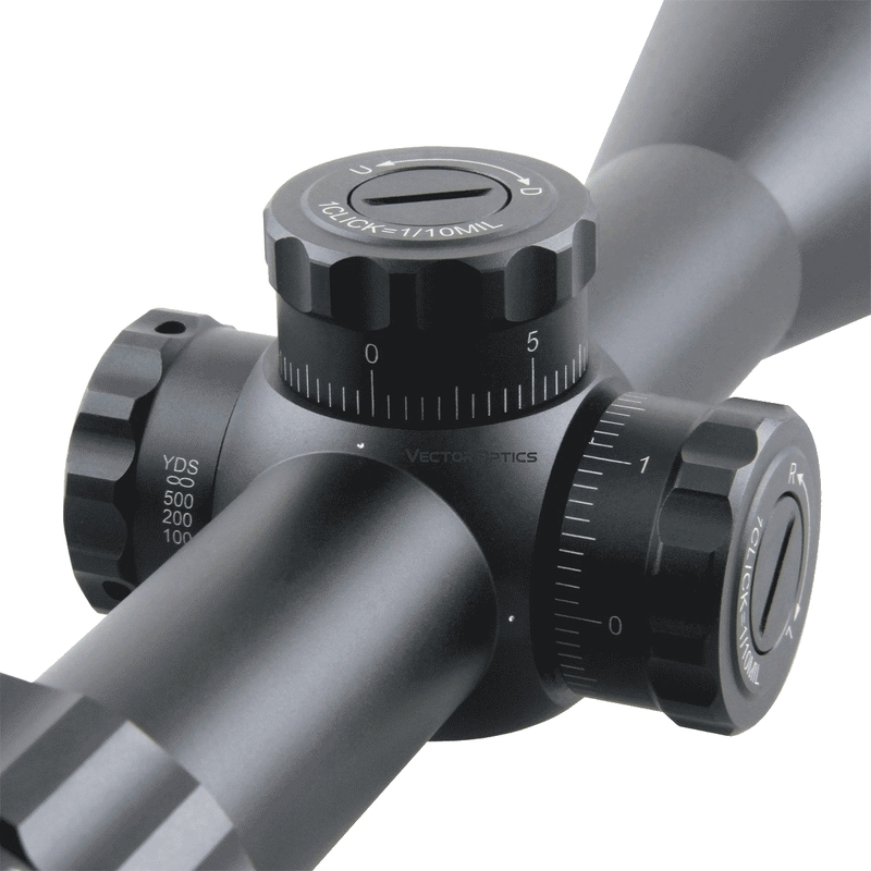 - Side focus: marked 10, 15, 25, 50, 100, 200, 500 yards to unlimited