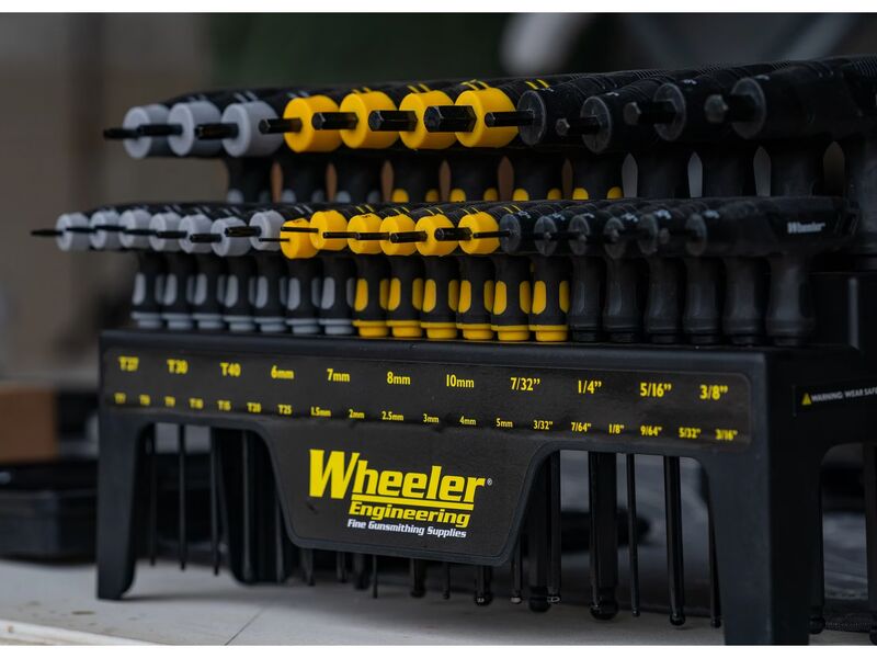 Complete your workbench setup with the Wheeler 30-Piece P-Handle Driver Set, an essential toolkit for any gunsmith or workshop enthusiast. This set offers a sleek molded stand that can be conveniently mounted on the wall, providing easy access to a wide range of SAE Hex, Metric Hex, and Torx drivers. Designed for durability and precision, the P-handle drivers allow for greater torque and control, making them perfect for detailed work on firearms or general workshop tasks. Keep your tools organized, accessible, and ready for any job with this high-quality set.
